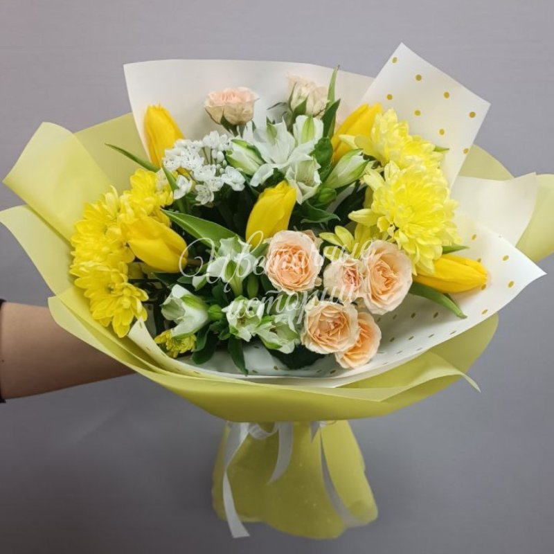 Мы можем создать букет под ваш бюджет, соблюдая все пожелания по составу и цветовой гамме. К букету можем добавить подарок, игрушку, сладости или фрукты.