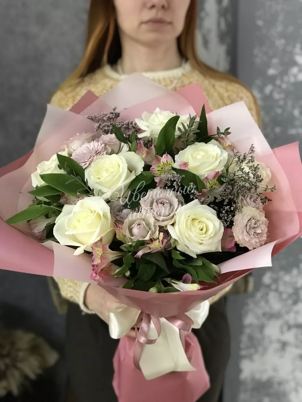 Мы можем создать букет под ваш бюджет, соблюдая все пожелания по составу и цветовой гамме. К букету можем добавить подарок, игрушку, сладости или фрукты.