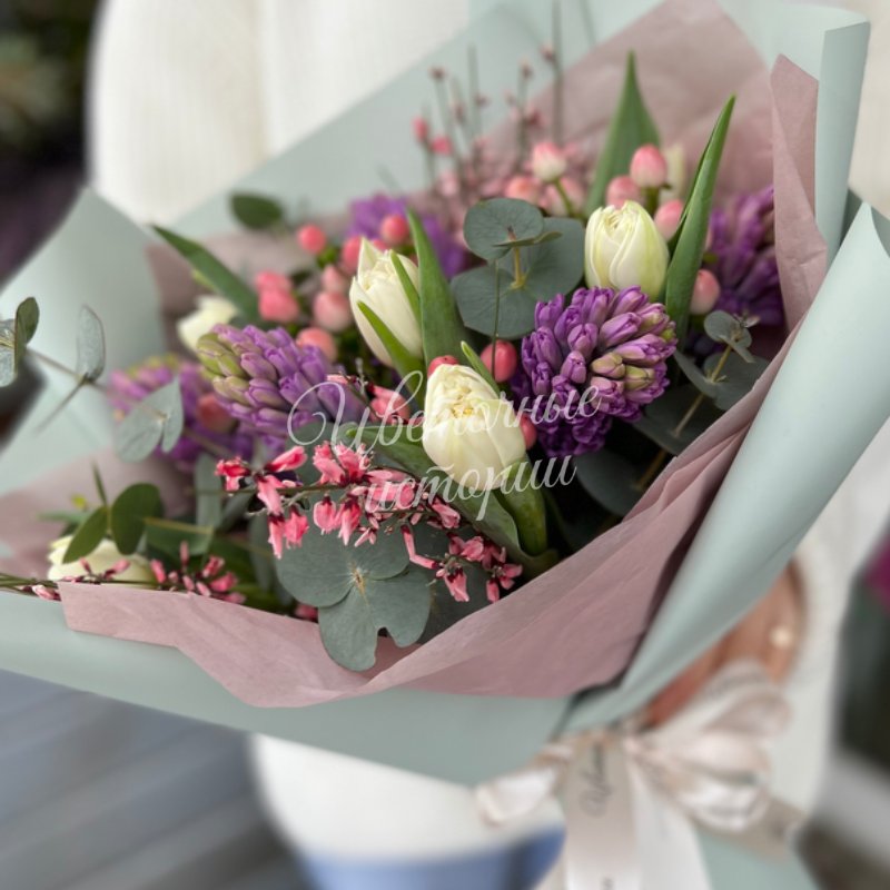 Букет в модных оттенках этого года, с ароматными гиацинтами и воздушной генистой удивит и порадует любую получательницу