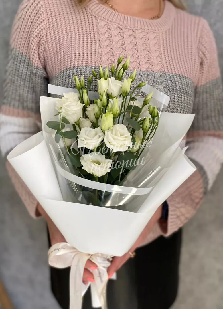 Небольшой монобукет из белой эустомы в пышной упаковке.Эустома считается чемпионом по стойкости, неделя в вазе гарантировано.