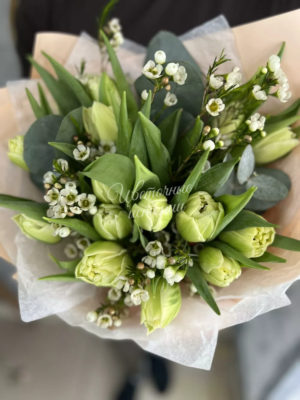 Нежнейший букет из пионовидных тюльпанов с добавлением шамелациума и эвкалипта в пышной упаковке.