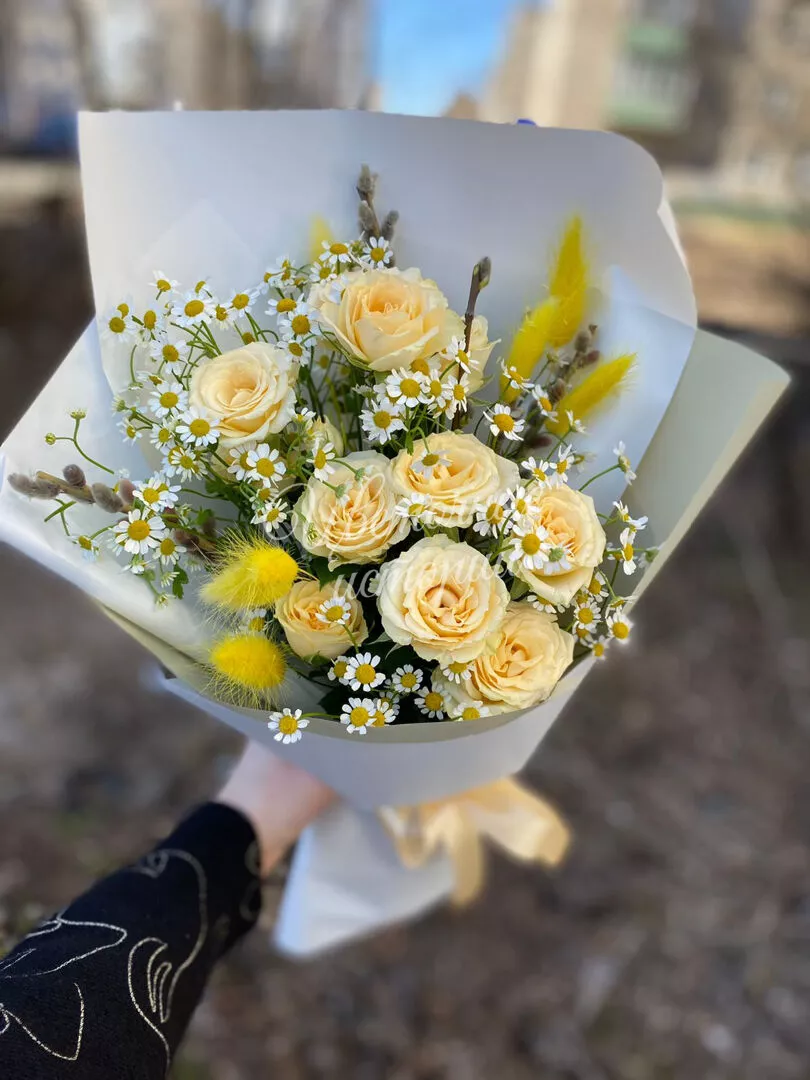 Светлый милый букет с кустовой розой и танацетумом создаст праздничное настроение и порадует получателя по любому поводу.