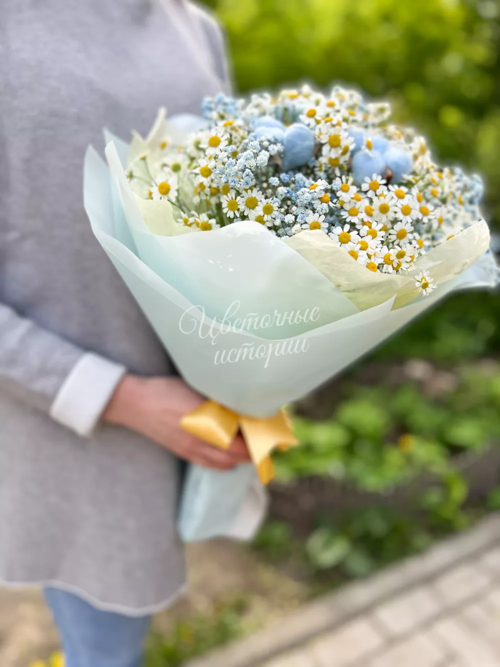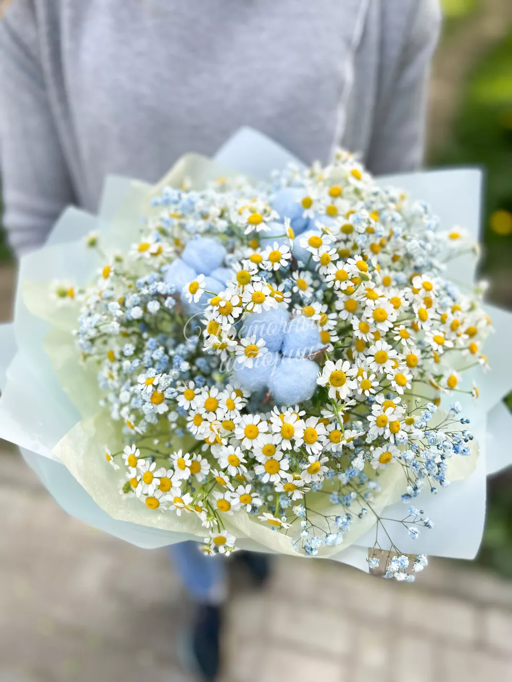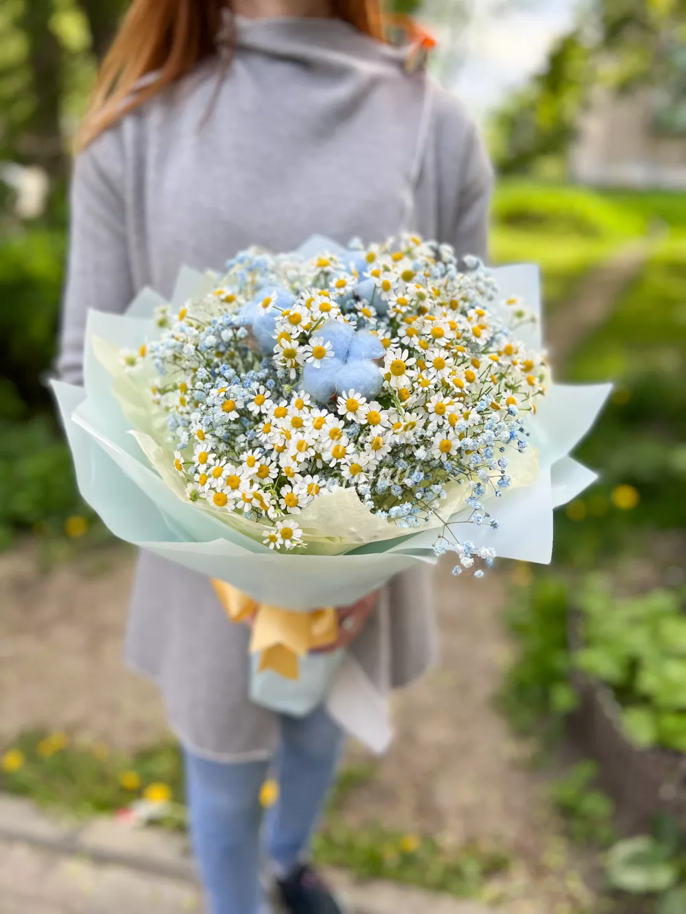 Летнее голубое небо окрасило брызги гипсофилы и мягкие подушечки хлопка, и все это погрузилось в ромашковый луг! Невероятный летний, нежный и невесомый букетик ! Он как будто говорит все впереди. Наслаждайся летом 😁