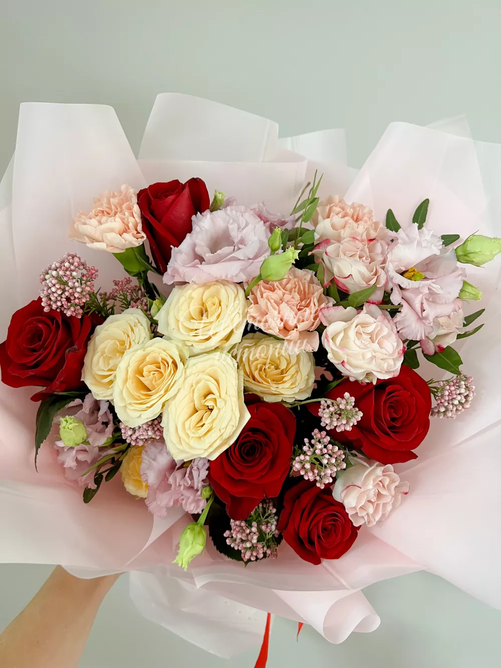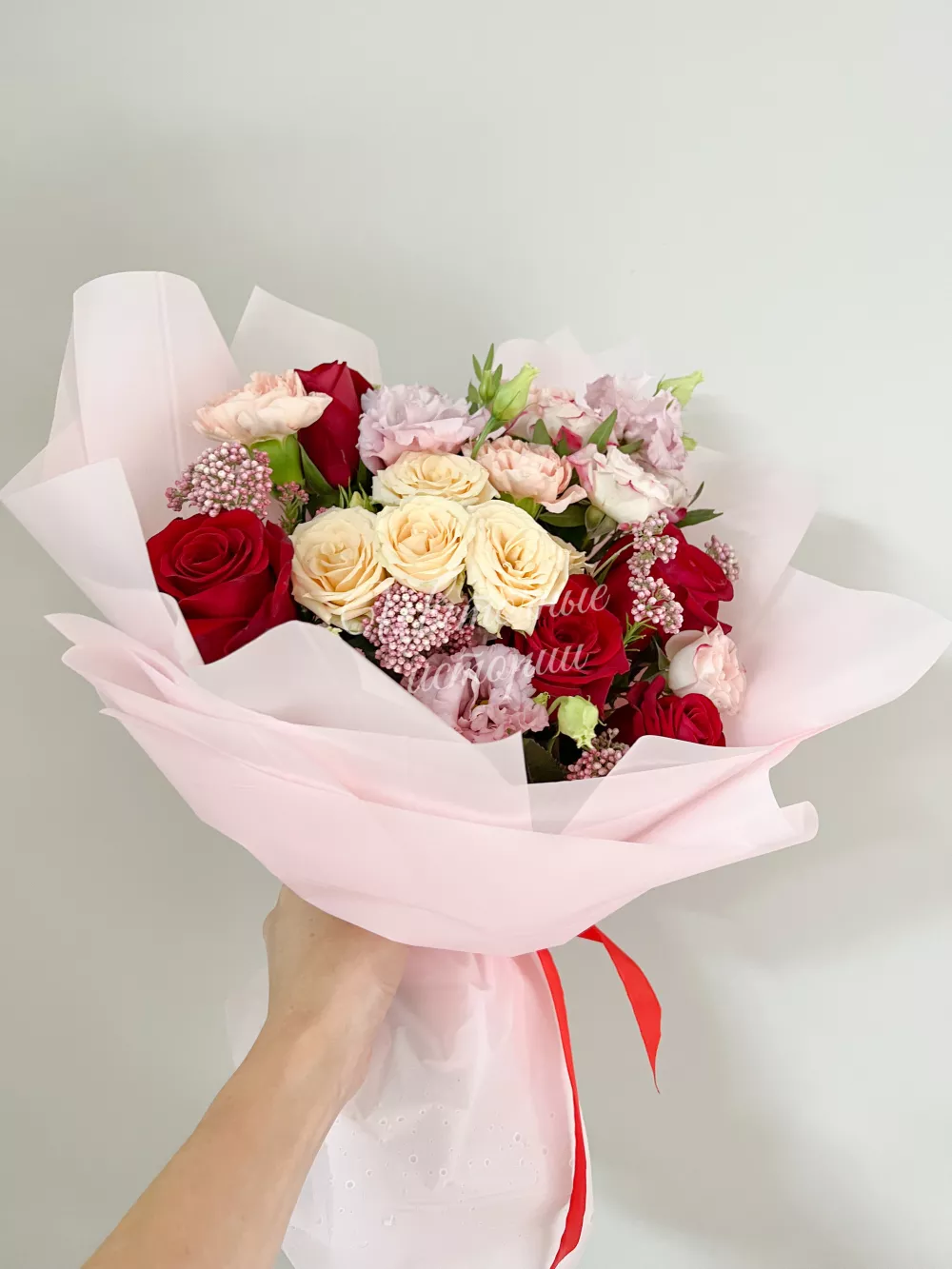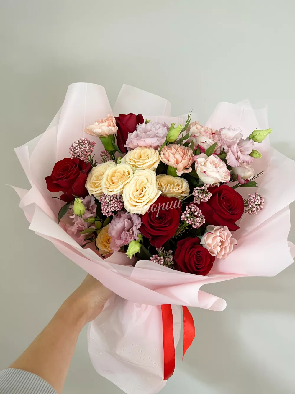 Необычное сочетание красного , кремового и розового притягивают взгляд. В этом случае можно сказать что букет и яркий и нежный одновременно!