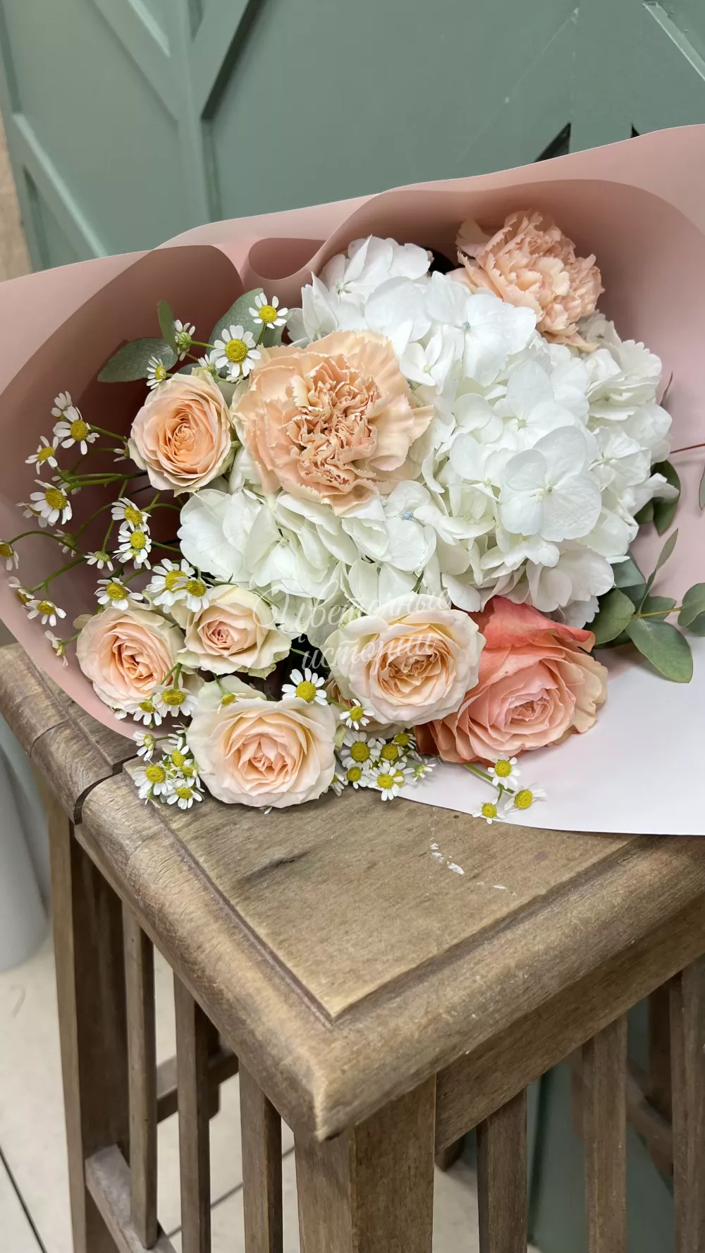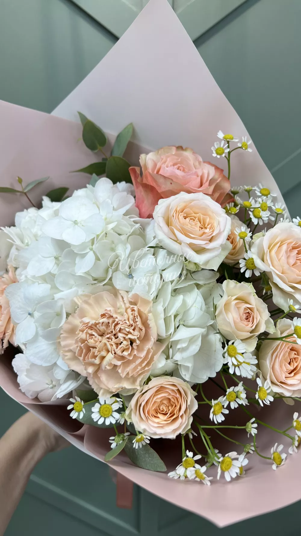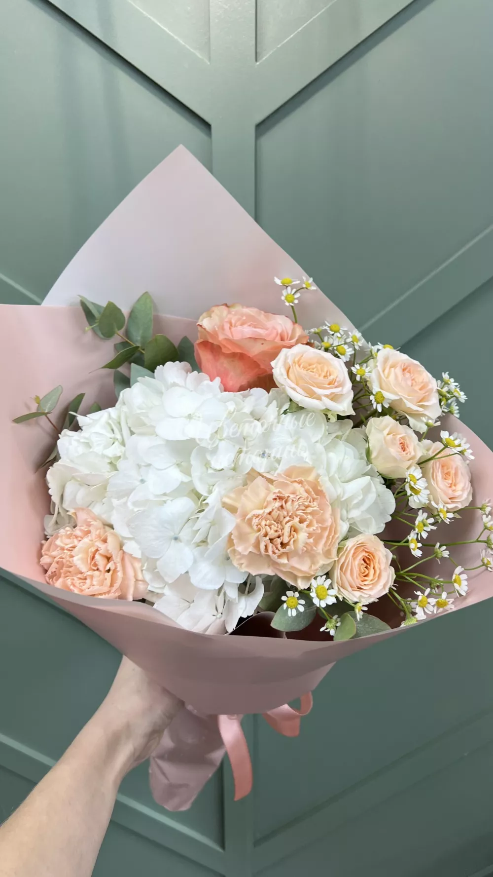 Белая кружевная гортензия, персиковая гвоздика и озорная ромашка, создают красивый тандем!