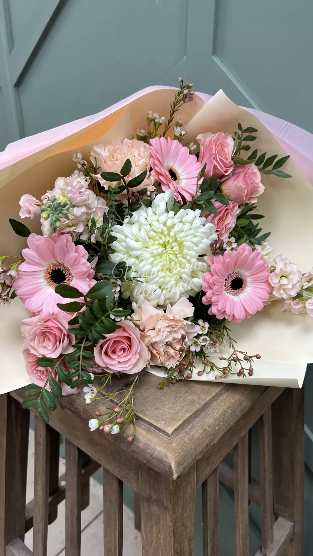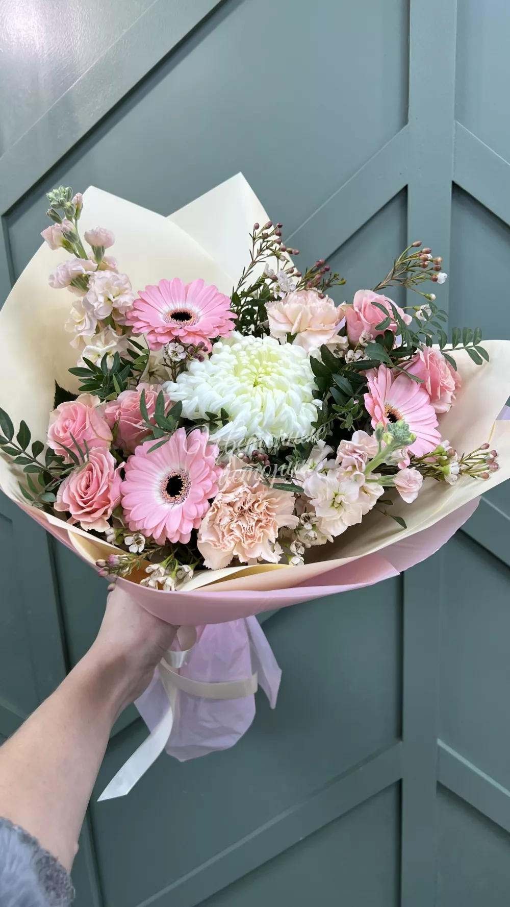 Кудрявая хризантема, ароматная маттиола и кружевная гвоздика создают прекрасный тандем в нежном букете.