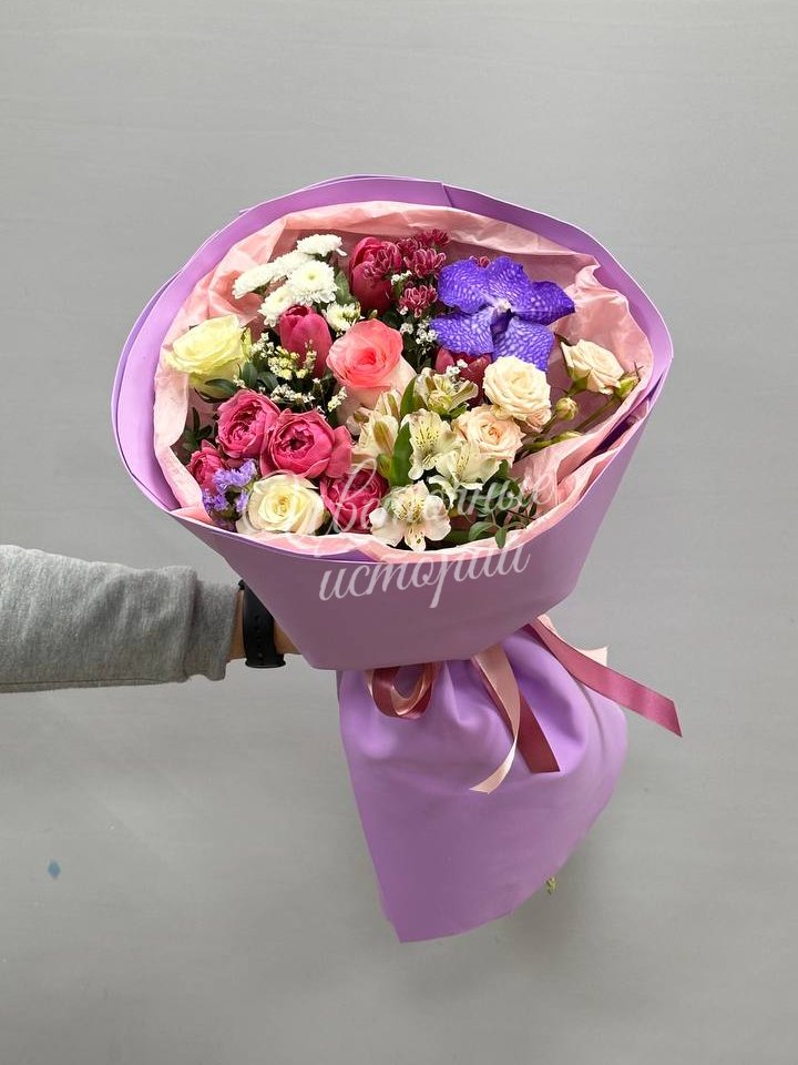 Мы можем создать букет под ваш бюджет, соблюдая все пожелания по составу и цветовой гамме. К букету можем добавить подарок, игрушку, сладости или фрукты.