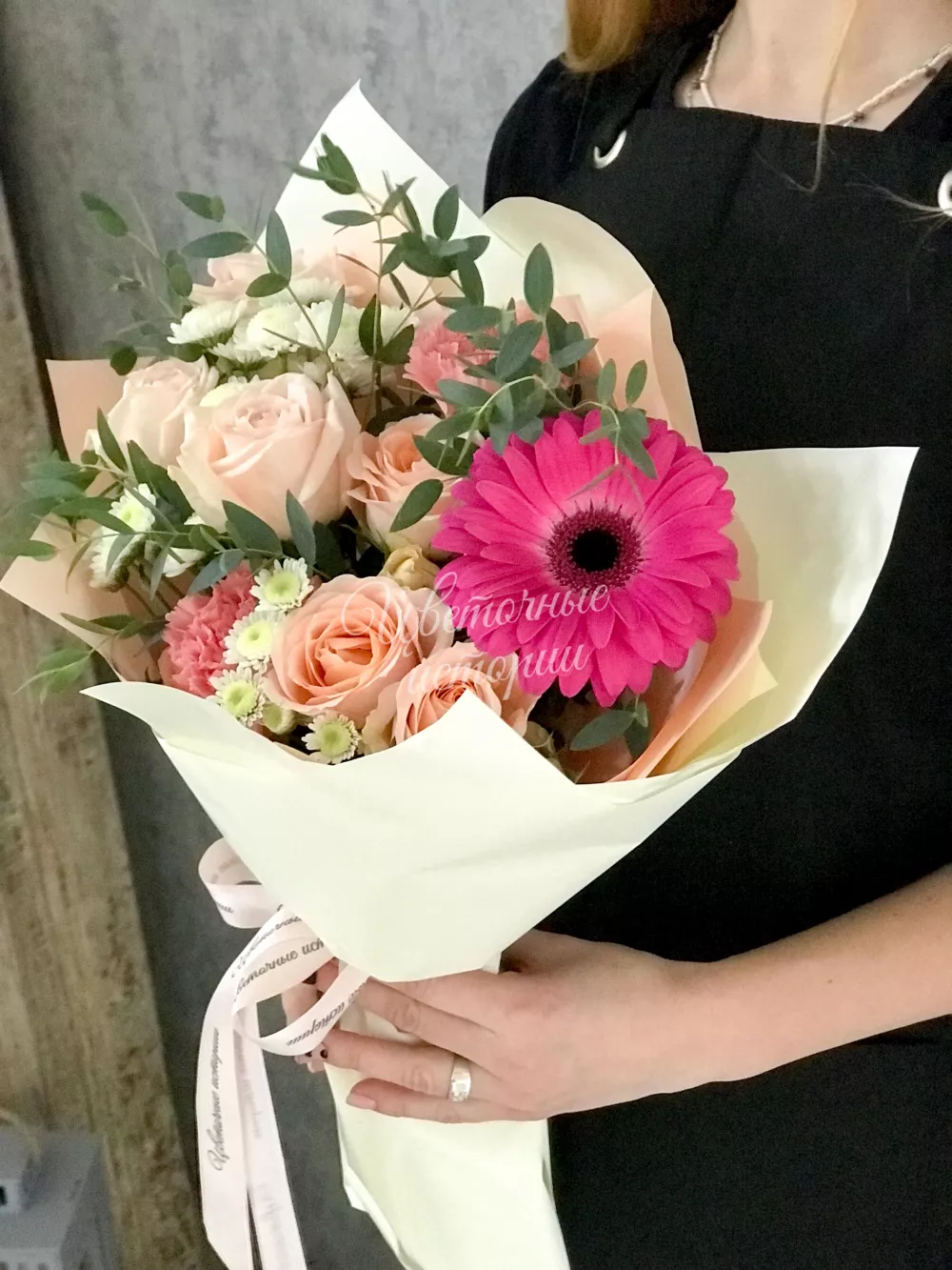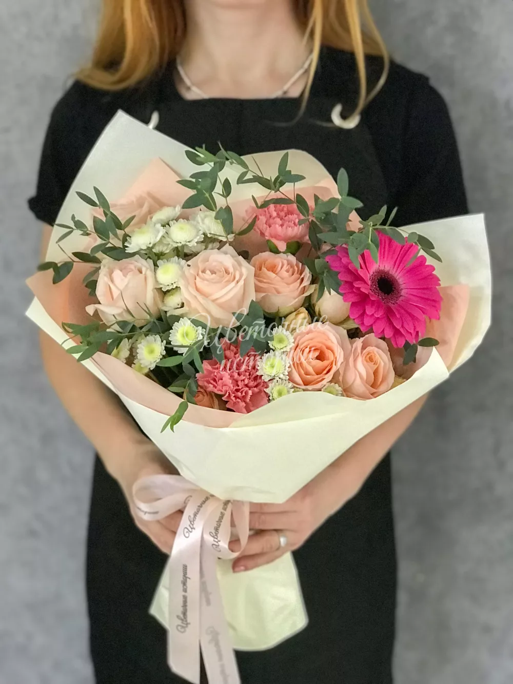 Мы можем создать букет под ваш бюджет, соблюдая все пожелания по составу и цветовой гамме. К букету можем добавить подарок, игрушку, сладости или фрукты.