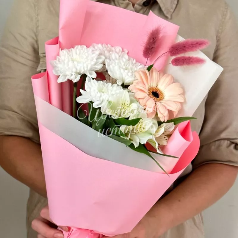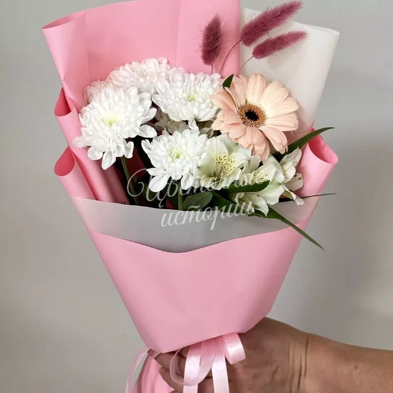 Мы можем создать букет под ваш бюджет, соблюдая все пожелания по составу и цветовой гамме. К букету можем добавить подарок, игрушку, сладости или фрукты.