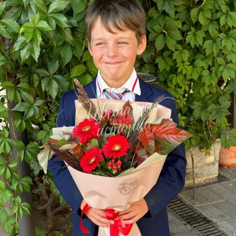 Букет "Пламя знаний" - это яркое, огненное сочетание цветов, наполняющее сердца учеников и педагогов в первый день учебного года.Этот букет является прекрасным подарком для учителей, учеников и всех, кто ценит силу образования.