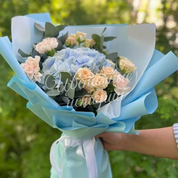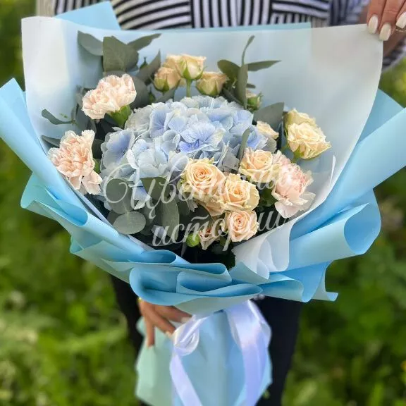 Летний букет с нежными кустовыми розами и красавицей гортензией ,,королевы летнего сезона ,,д