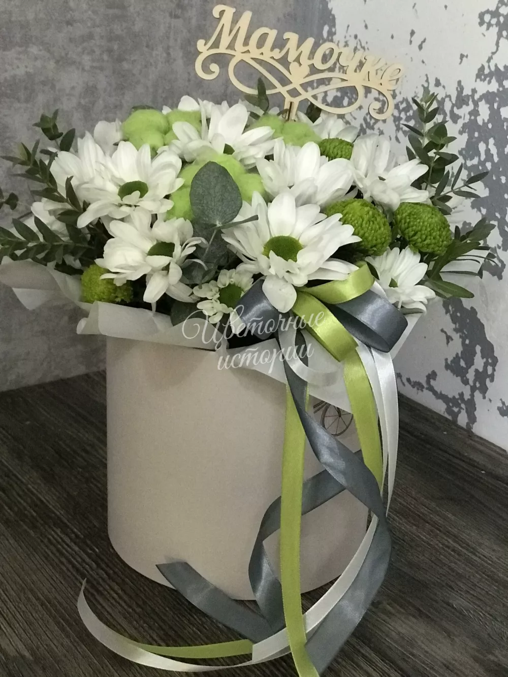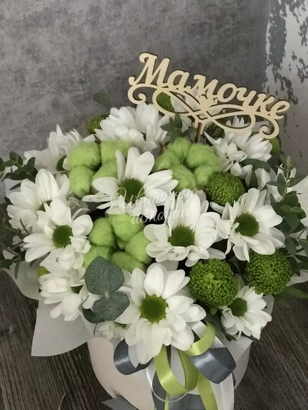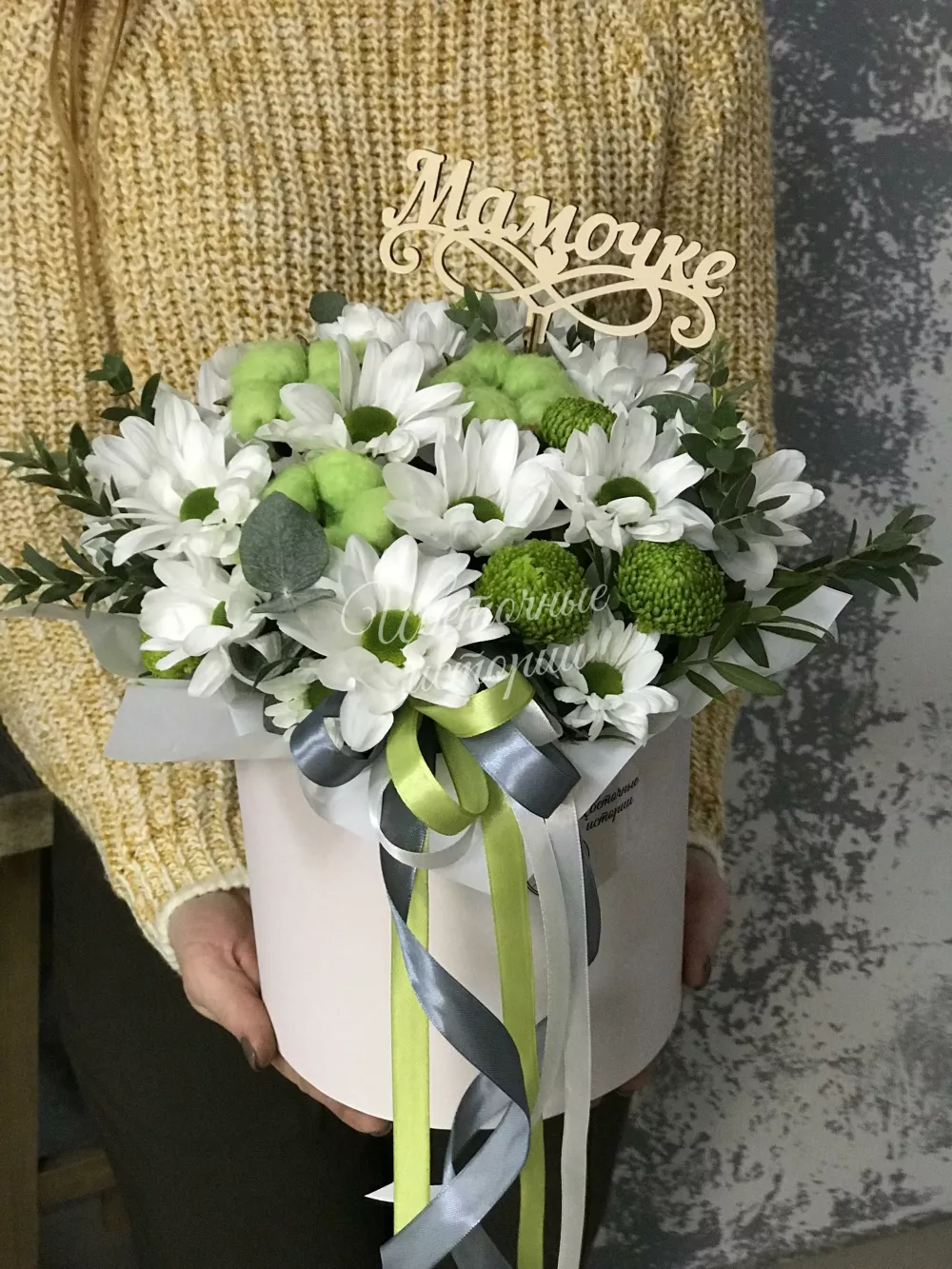 Коробочка из пушистого хлопка и свежей хризантемы ! Такое сочетание цветов -чистейший белый и зелёный яблочный - восхищает своей нежностью. Прекрасный подарок на День матери для самой любимой мамы!