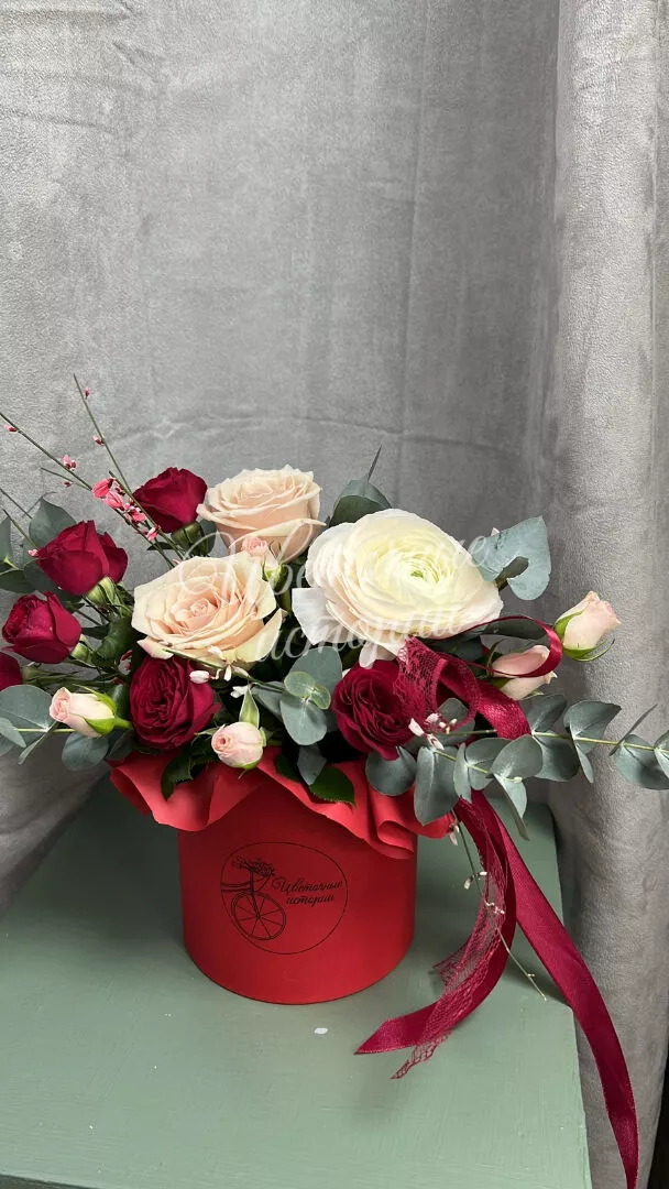 Коробка с весенними цветами -ранункулюсами ,генистой это чудесный подарок для самых любимых