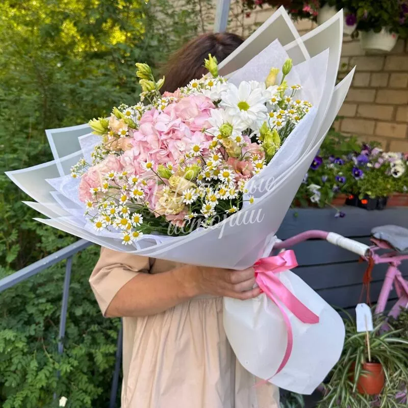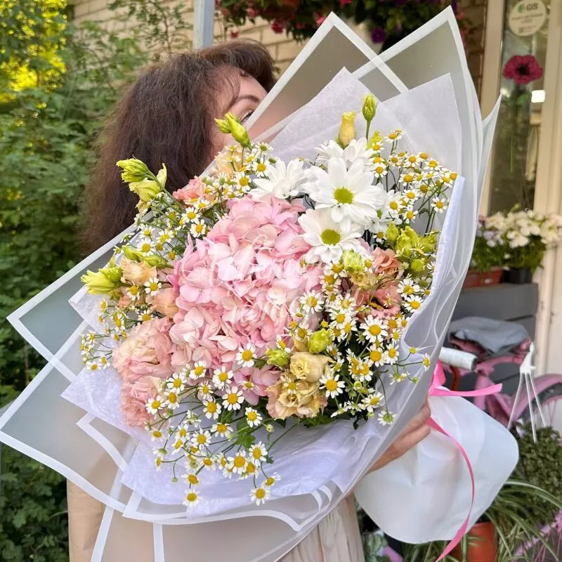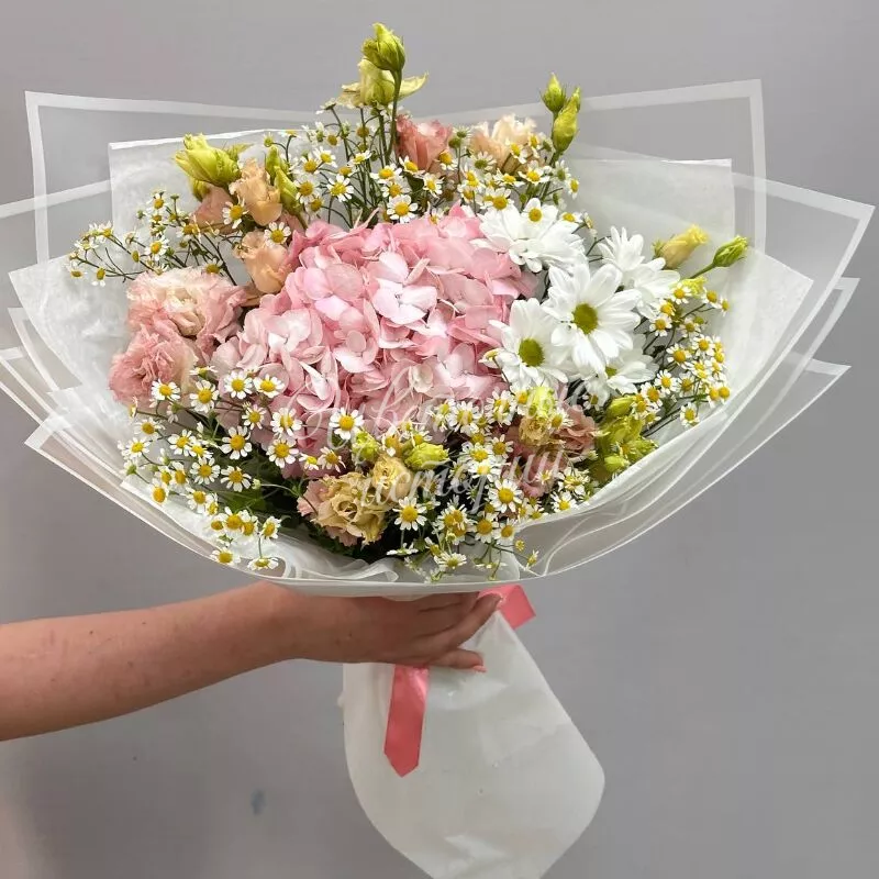 Этот букет, наполненный розовыми гортензиями и белыми ромашками, напоминает о рассвете. Розовые гортензии символизируют теплоту и нежность, в то время как белые ромашки добавляют нотку простоты и невинности.