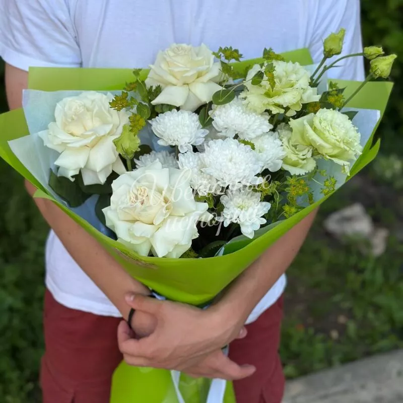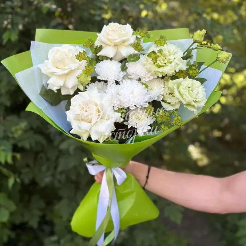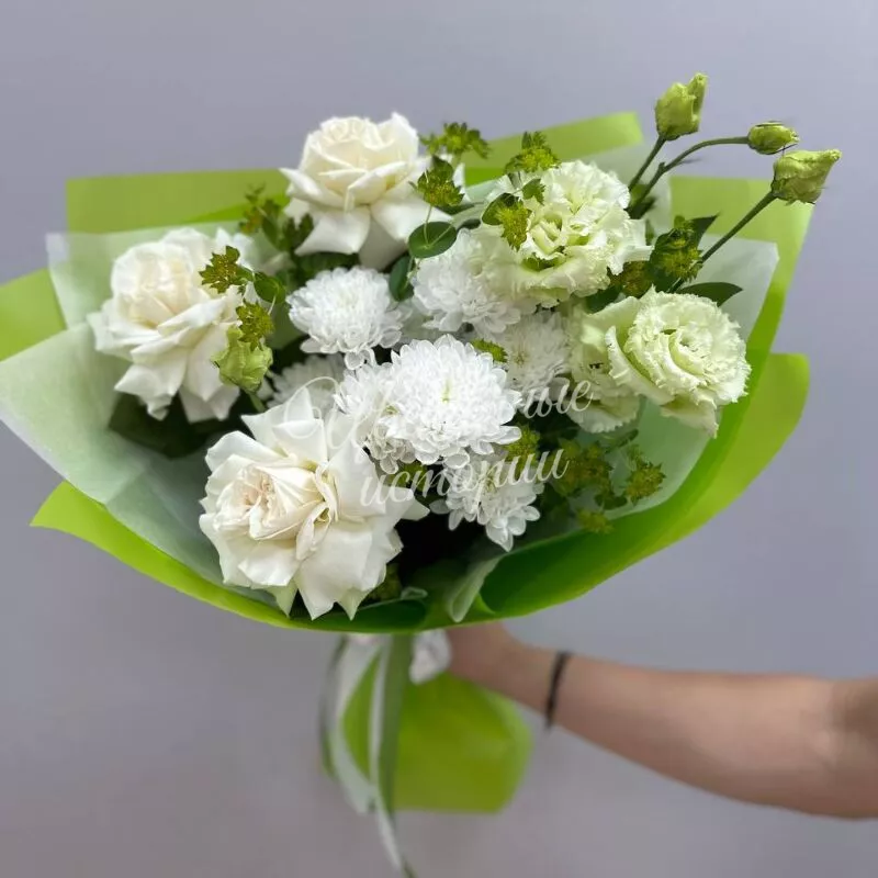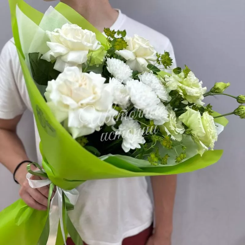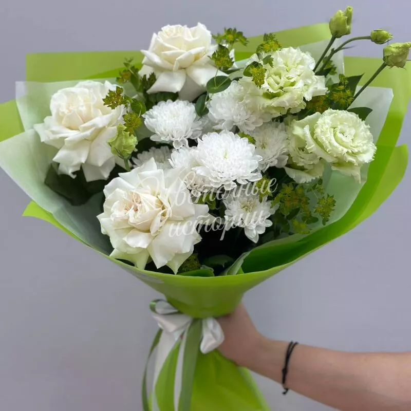 Красивый букет в бело-зеленой тональности,ставший настоящим хитом,подарите хорошее настроение и незабываемые эмоции.
