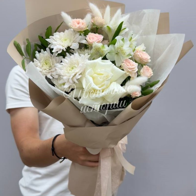 Мы можем создать букет под ваш бюджет, соблюдая все пожелания по составу и цветовой гамме. К букету можем добавить подарок, игрушку, сладости или фрукты.