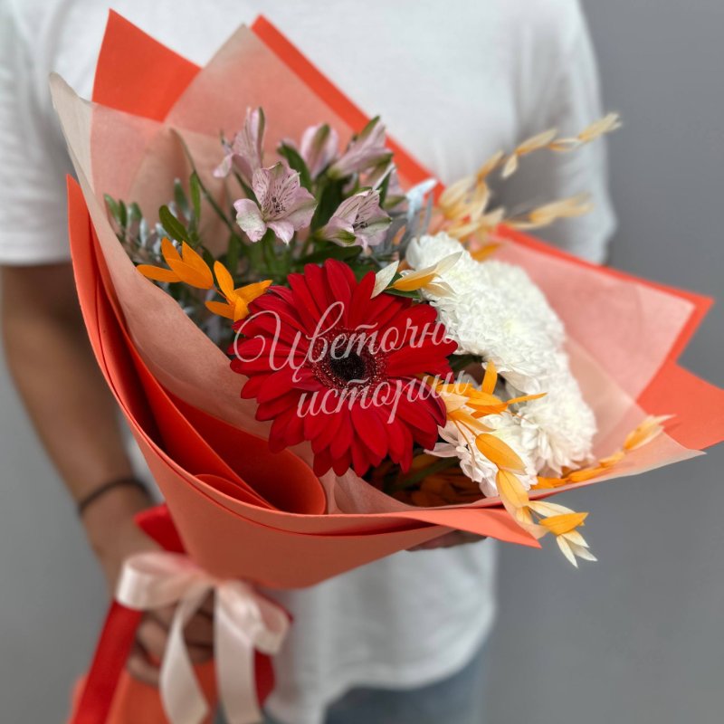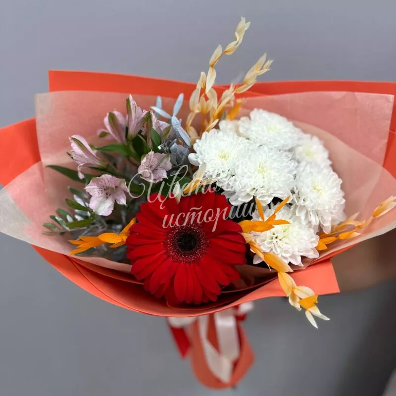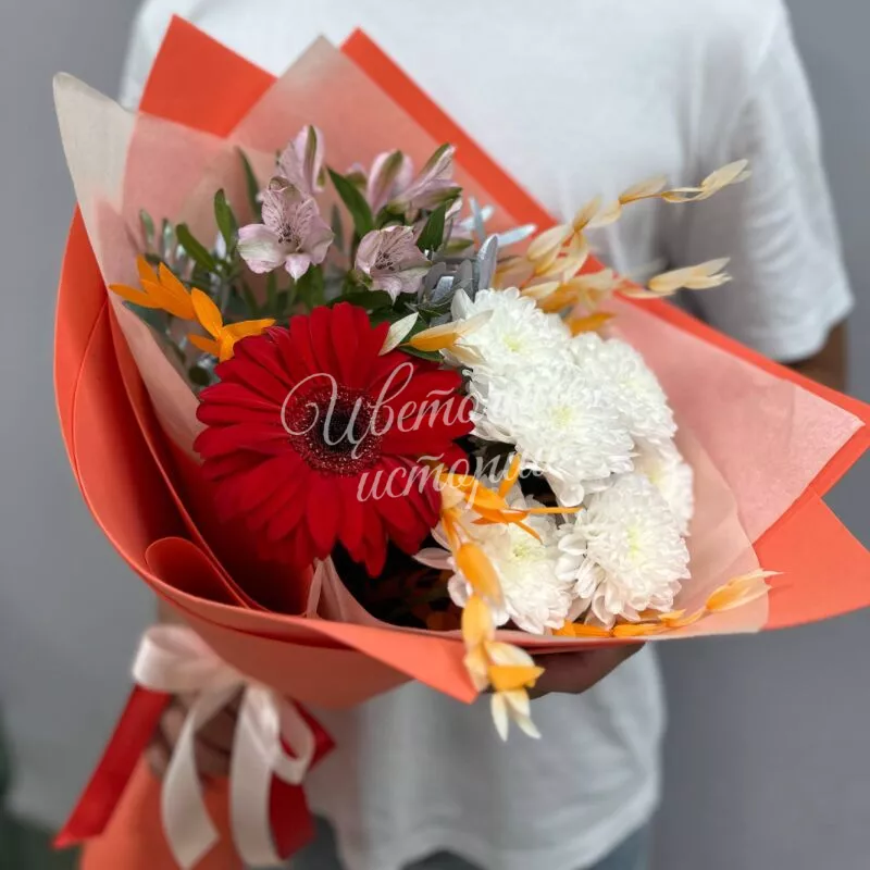 Мы можем создать букет под ваш бюджет, соблюдая все пожелания по составу и цветовой гамме. К букету можем добавить подарок, игрушку, сладости или фрукты.