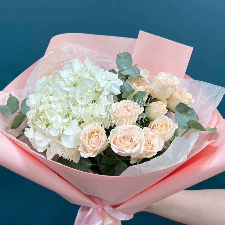 Букет из белых гортензий и нежно-розовых роз, элегантно упакованный в светло-розовую бумагу с атласной лентой. Этот букет излучает нежность и изящество, идеально подходя для любого торжественного случая. Сочетание воздушной гортензии и классической розы создает образ, полный гармонии и красоты.