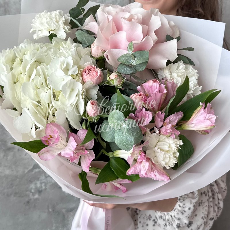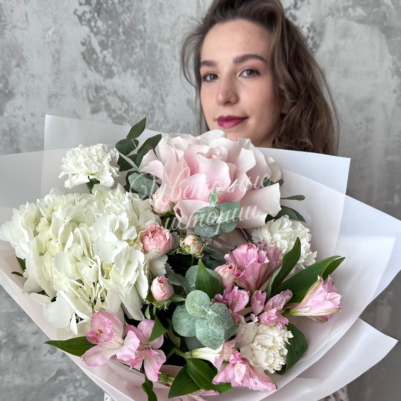 Букет с гортензией и французской розой «Весенний флер» — это утончённое сочетание нежных цветов, которое создаст атмосферу свежести и романтики. В его состав входят элегантные гортензии, изящные кустовые розы и французская роза, придающие композиции насыщенную палитру оттенков. Дополняют букет ароматный эвкалипт, яркое цветение диантусов и воздушные альстромерии, создавая гармоничный и жизнерадостный образ. Каждая деталь подобрана так, чтобы подчеркнуть красоту и утонченность флористической работы. Букет подходит для любого торжества или для того, чтобы порадовать близкого человека. Он отлично сохраняет свежесть и долго радует своим ароматом. «Весенний флер» станет ярким акцентом в интерьере и символом весны и любви.