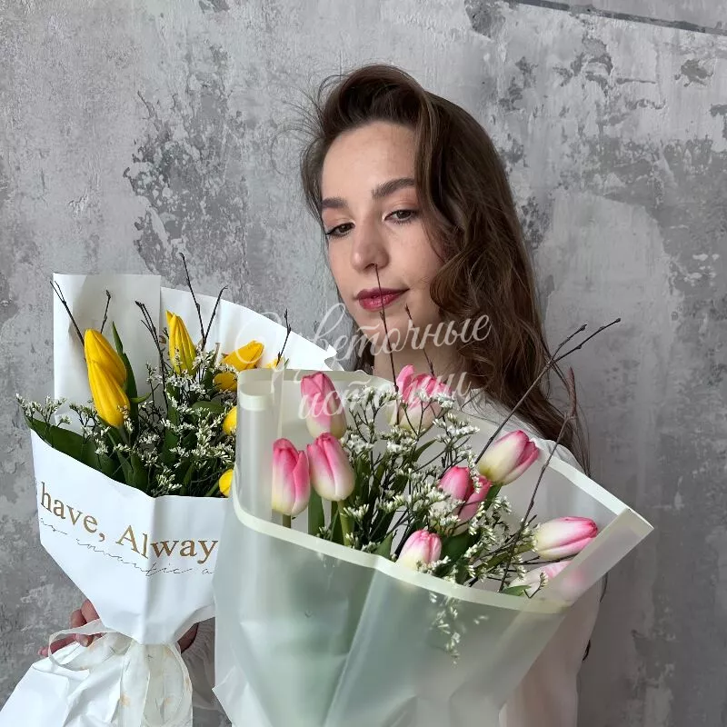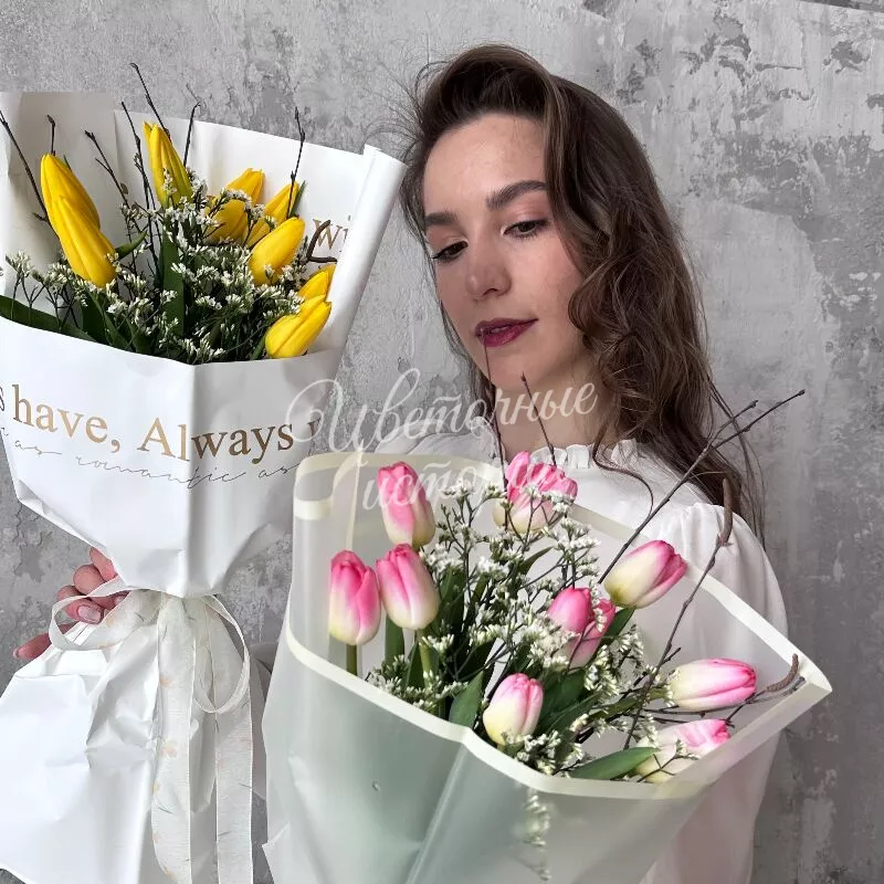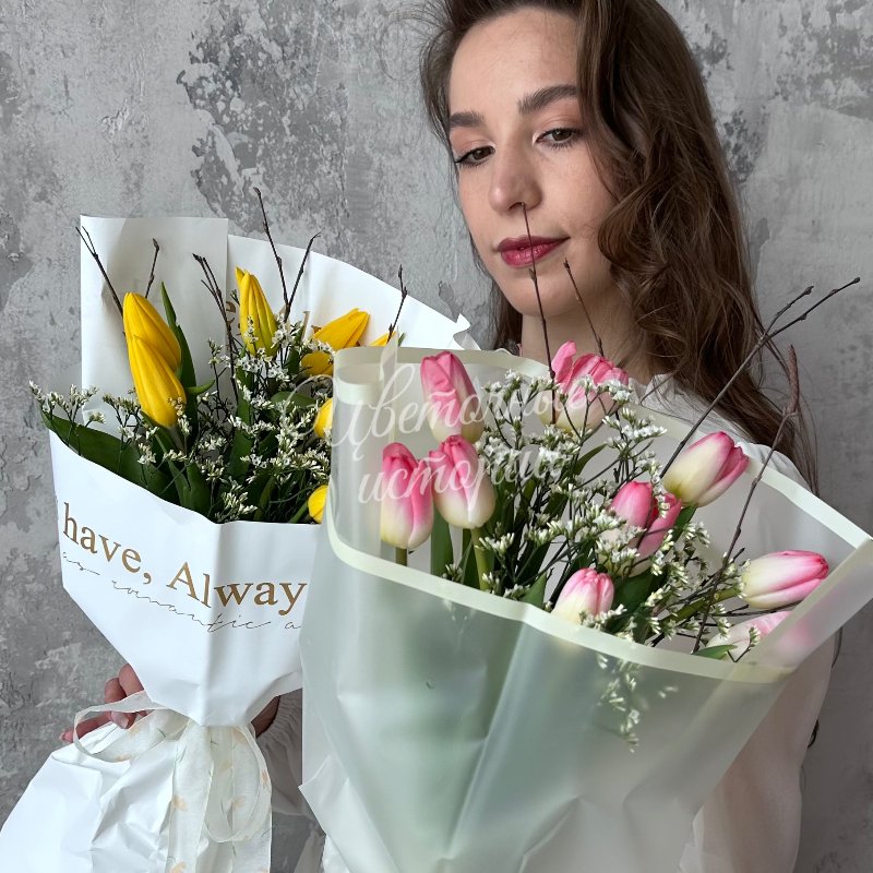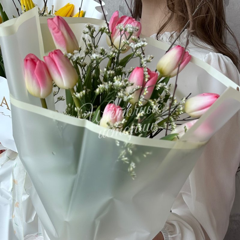Создайте неповторимую атмосферу весны с букетом из 11 свежих тюльпанов и нежных весенних веток. Этот красивый и свежий букет украсит любой дом или офис, добавив в пространство тепло и радость. В состав входит изящный лимониум и ароматные тюльпаны, которые создают гармоничное сочетание красок и текстур. Подарите близким настроение весны и бодрость с этим уникальным цветочным ансамблем. Идеальный выбор для тех, кто ценит красоту и свежесть натуры.