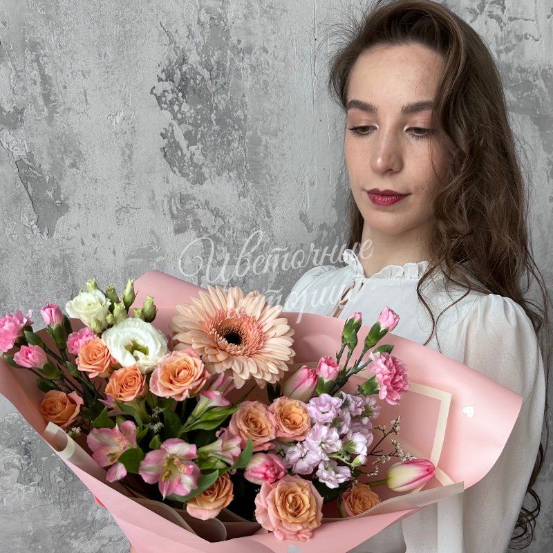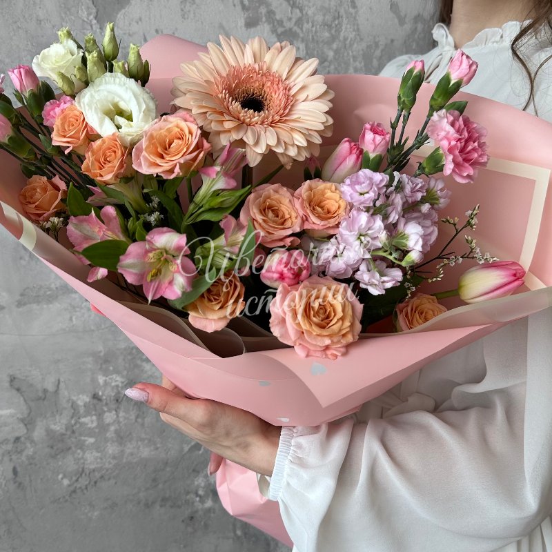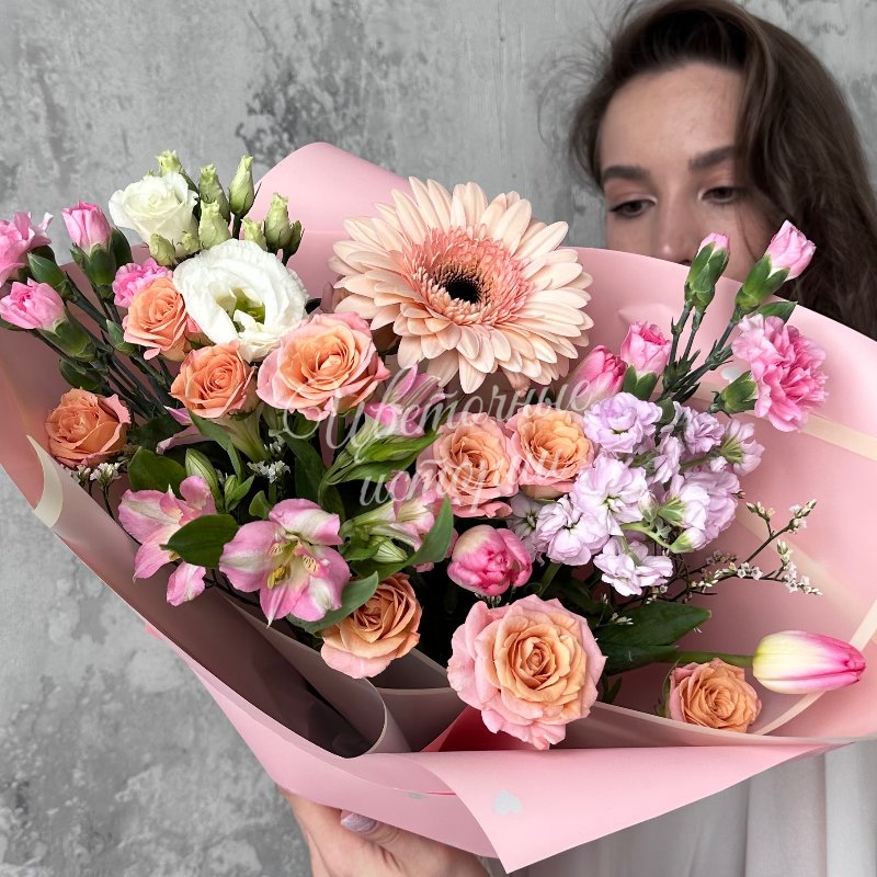 Универсальный и яркий букет «С весной, любимая» — идеальный подарок для любого повода. В его состав входят свежие герберы, лизиантусы и маттиолы, которые создают насыщенную и гармоничную композицию. Дополняют ее нежные тюльпаны, диантусы кустовые и роскошные кустовые розы, придавая букеты особую утонченность и элегантность. Этот букет наполнен светлом и теплом, он отлично подчеркнет вашу искреннюю любовь и заботу. Он прекрасно подойдет как для поздравления, так и для выражения нежных чувств. Эксклюзивный дизайн и свежие цветы делают его незабываемым подарком.