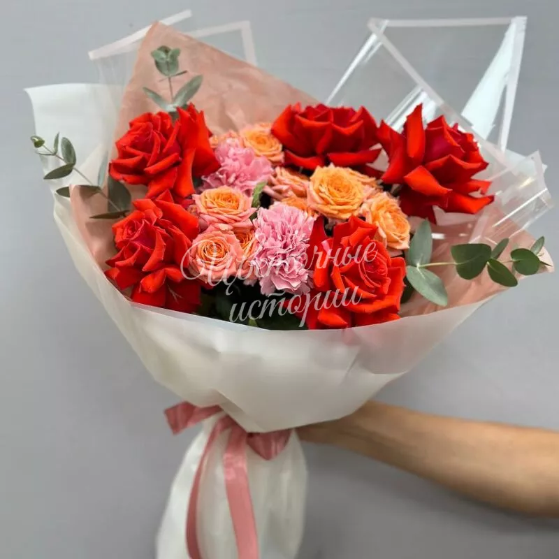 Мы можем создать букет под ваш бюджет, соблюдая все пожелания по составу и цветовой гамме. К букету можем добавить подарок, игрушку, сладости или фрукты.