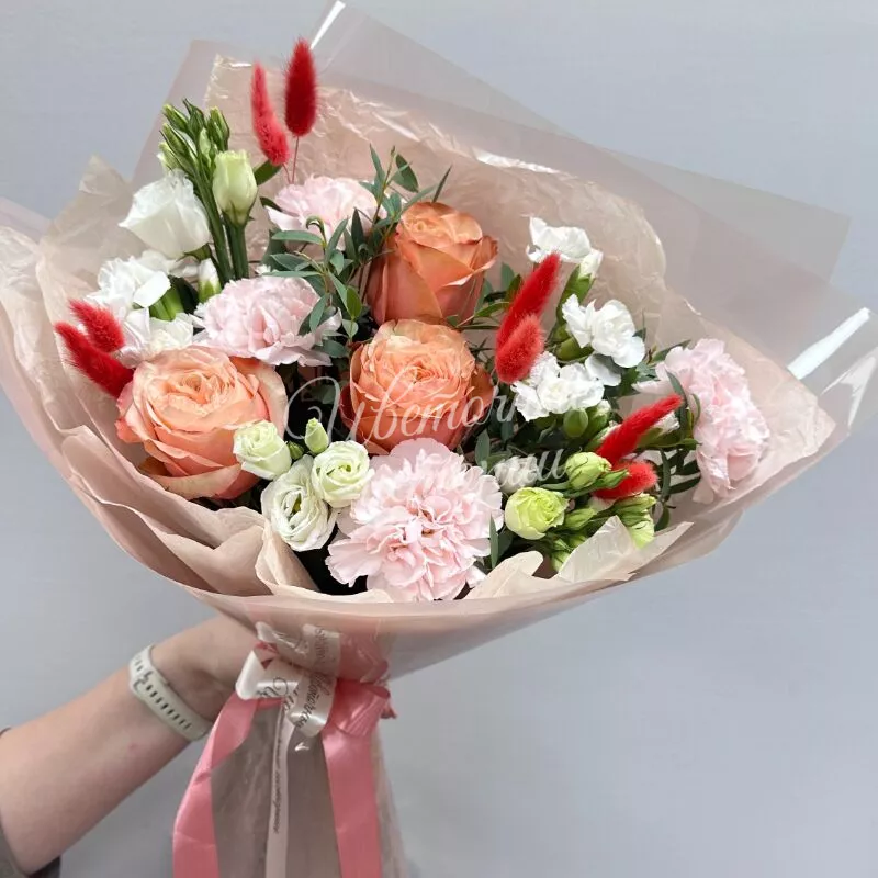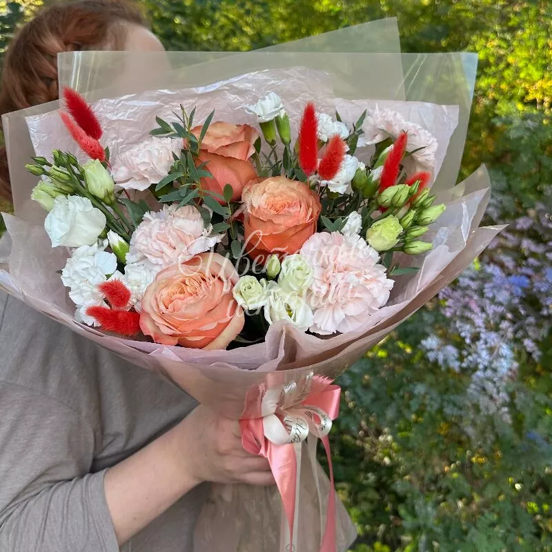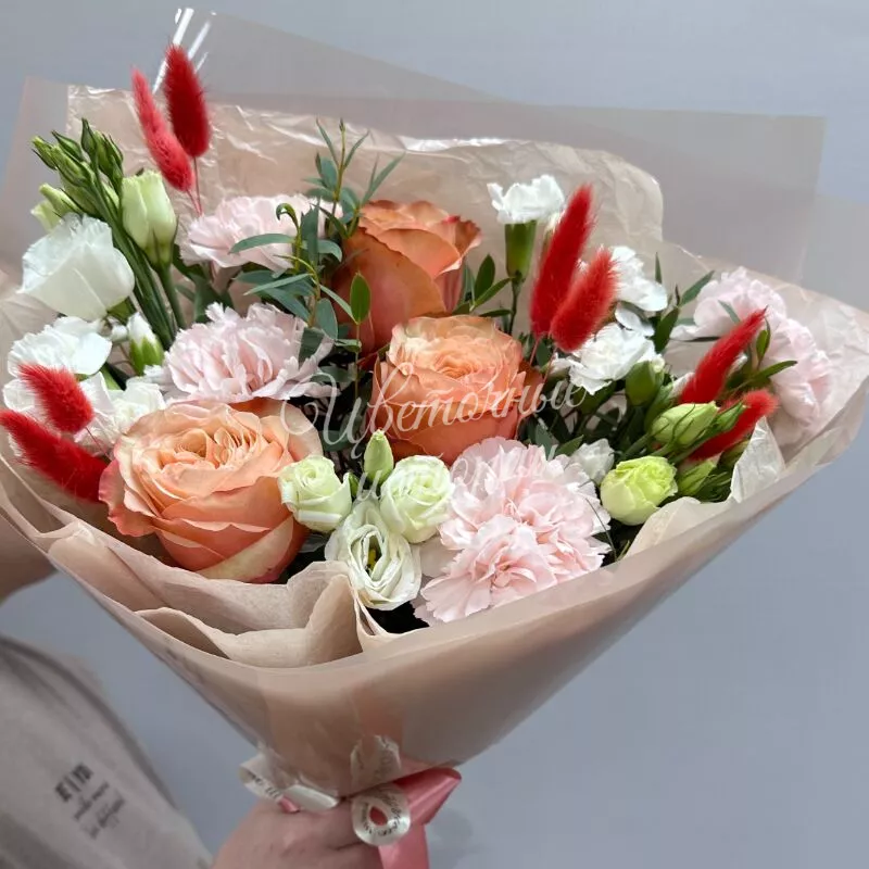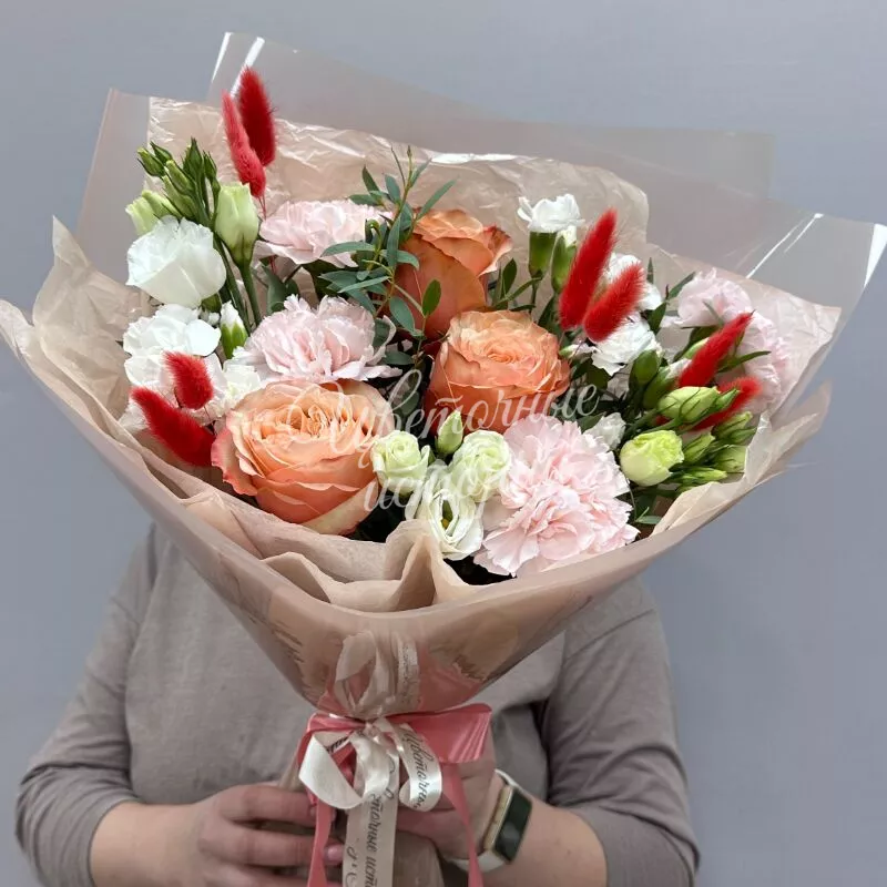 Букет «Розовый сон» — нежное сочетание фисташки, лагуруса, пионовидной розы, эустомы и диантуса. Идеальный подарок для романтичных моментов и особых случаев. Легкие пастельные оттенки создают атмосферу уюта и гармонии.