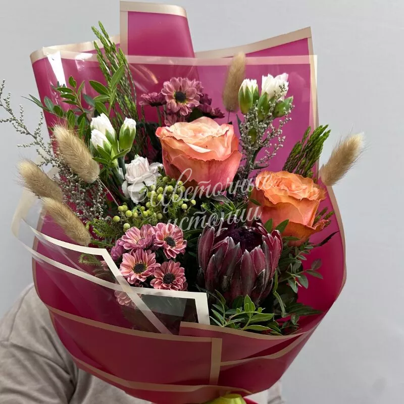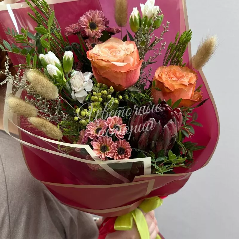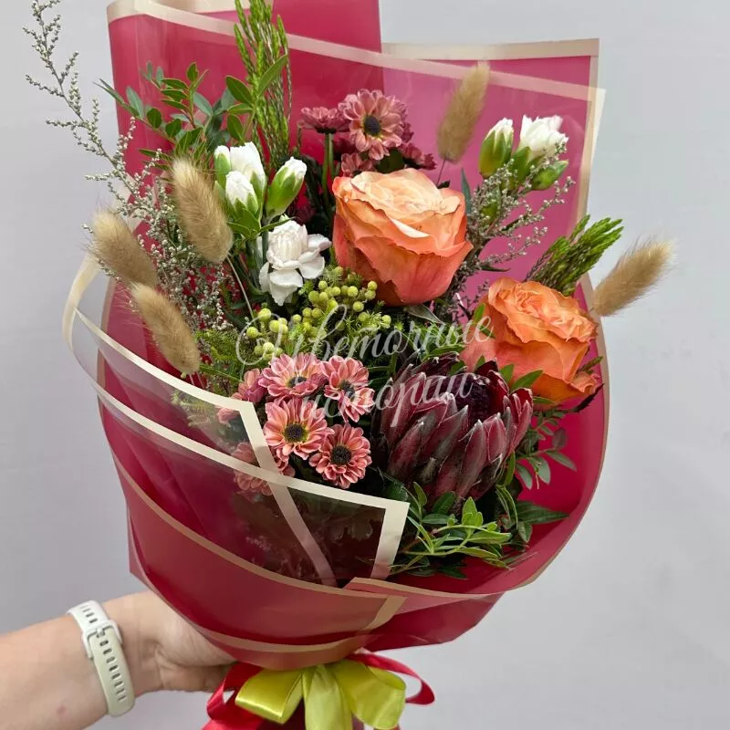 Букет «Осенний ферверк» — это яркая композиция из сезонных цветов, наполняющая пространство теплыми красками. Каждый элемент подчеркивает природное богатство осени, создавая гармоничный ансамбль. Букет идеально подходит для подарка близким или украшения интерьера.
