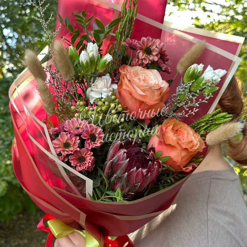 Мы можем создать букет под ваш бюджет, соблюдая все пожелания по составу и цветовой гамме. К букету можем добавить подарок, игрушку, сладости или фрукты.