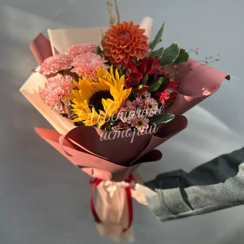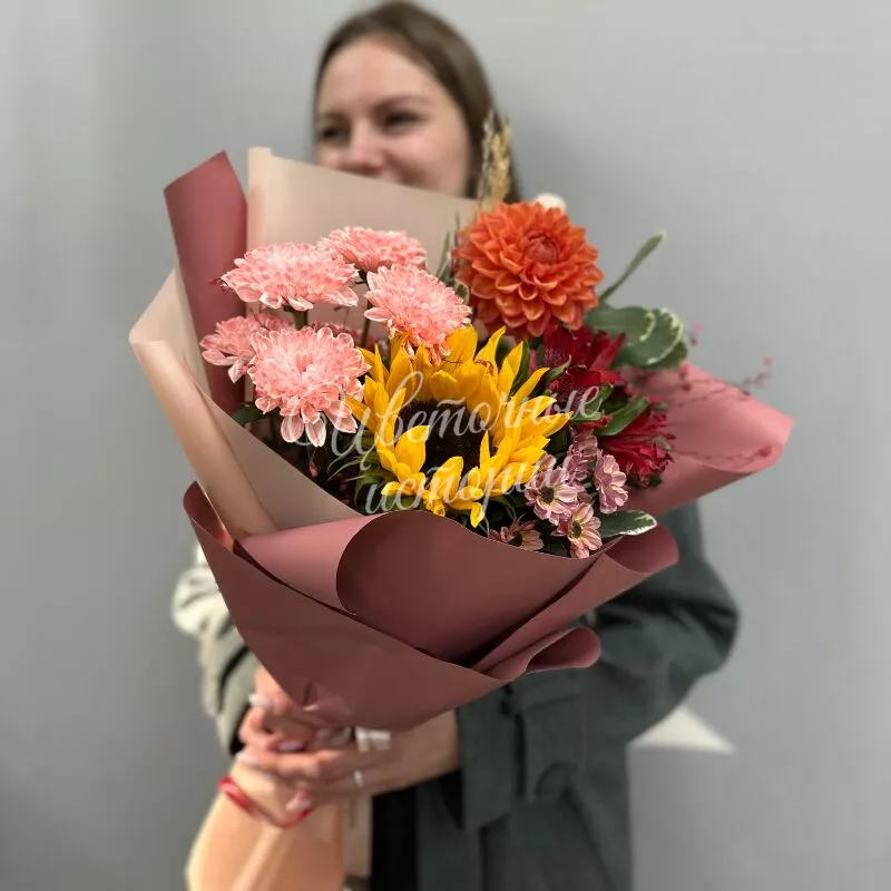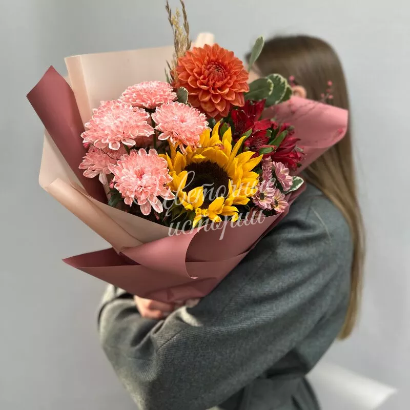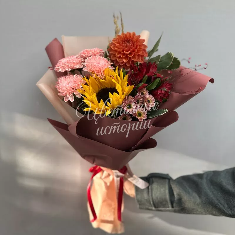 Букет «Солнечная осень» наполнен теплыми красками уходящего лета и яркими акцентами осени. Альстромерия, кустовые хризантемы, георгины и подсолнухи создают жизнерадостный образ, напоминающий о солнечных днях