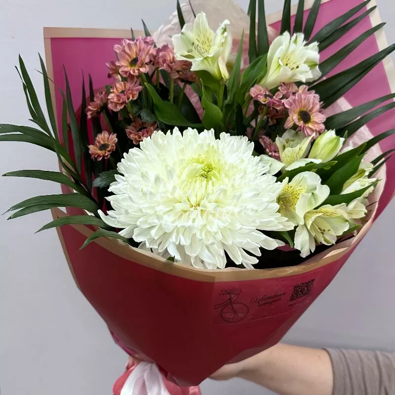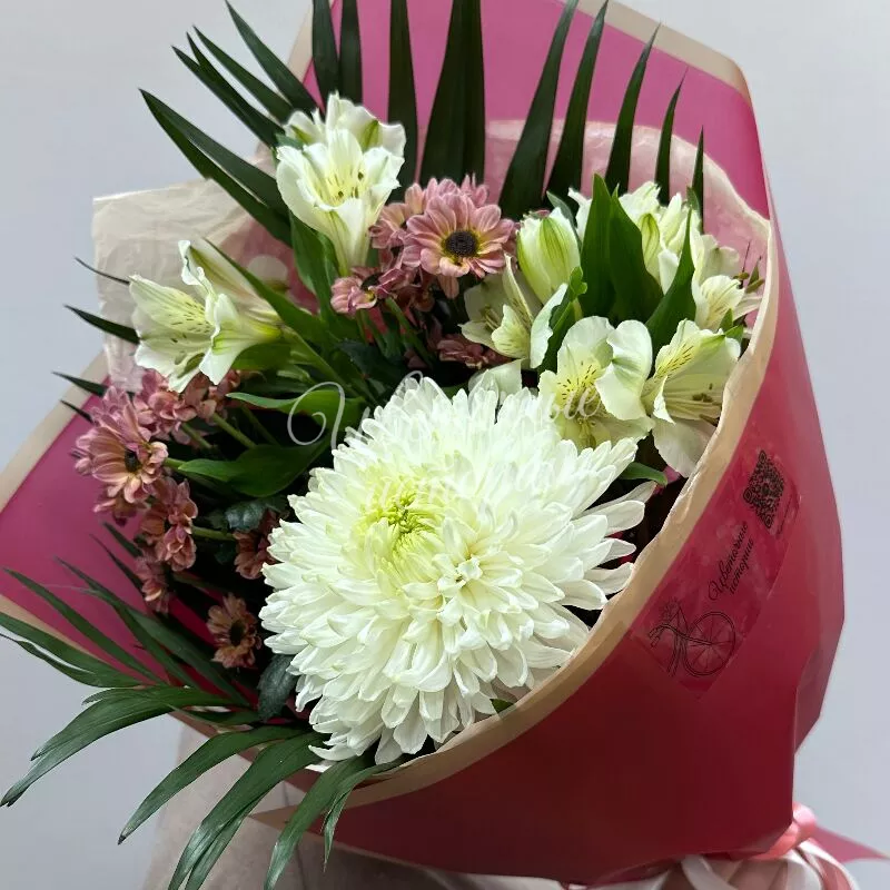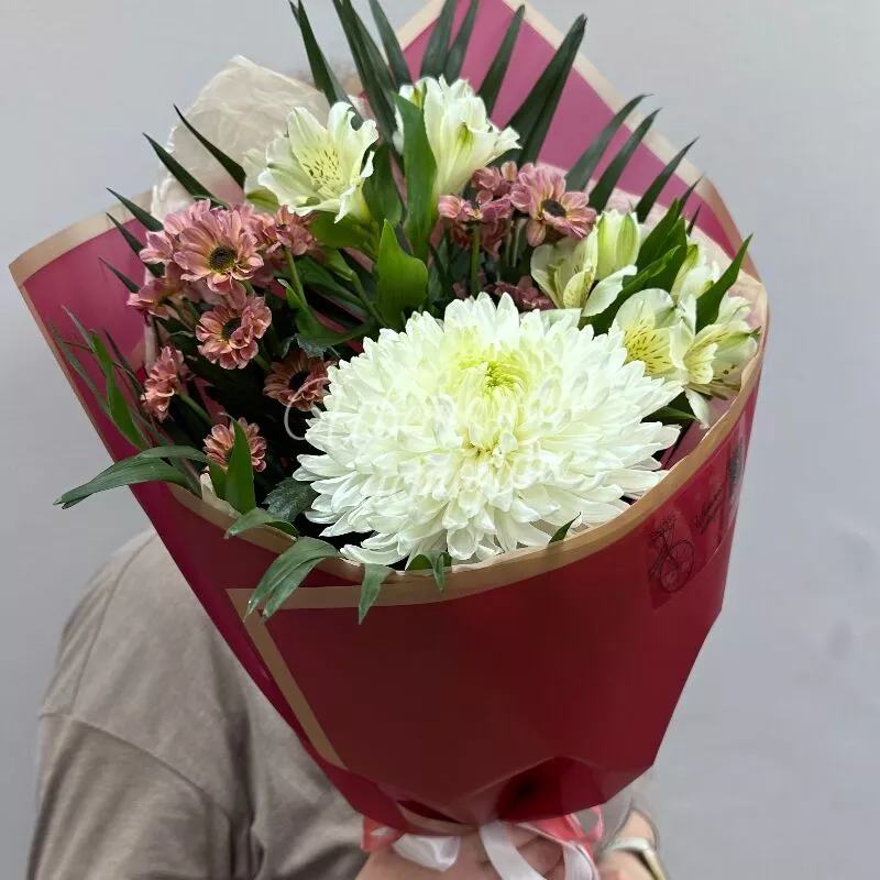Букет «Лепестки счастья» — это нежное сочетание кустовой и одноголосой хризантемы в обрамлении изящных альстромерий. Каждый цветок тщательно отобран и собран вручную для создания гармоничной композиции. Идеальный подарок для любимых, коллег или близких, чтобы выразить теплые чувства.