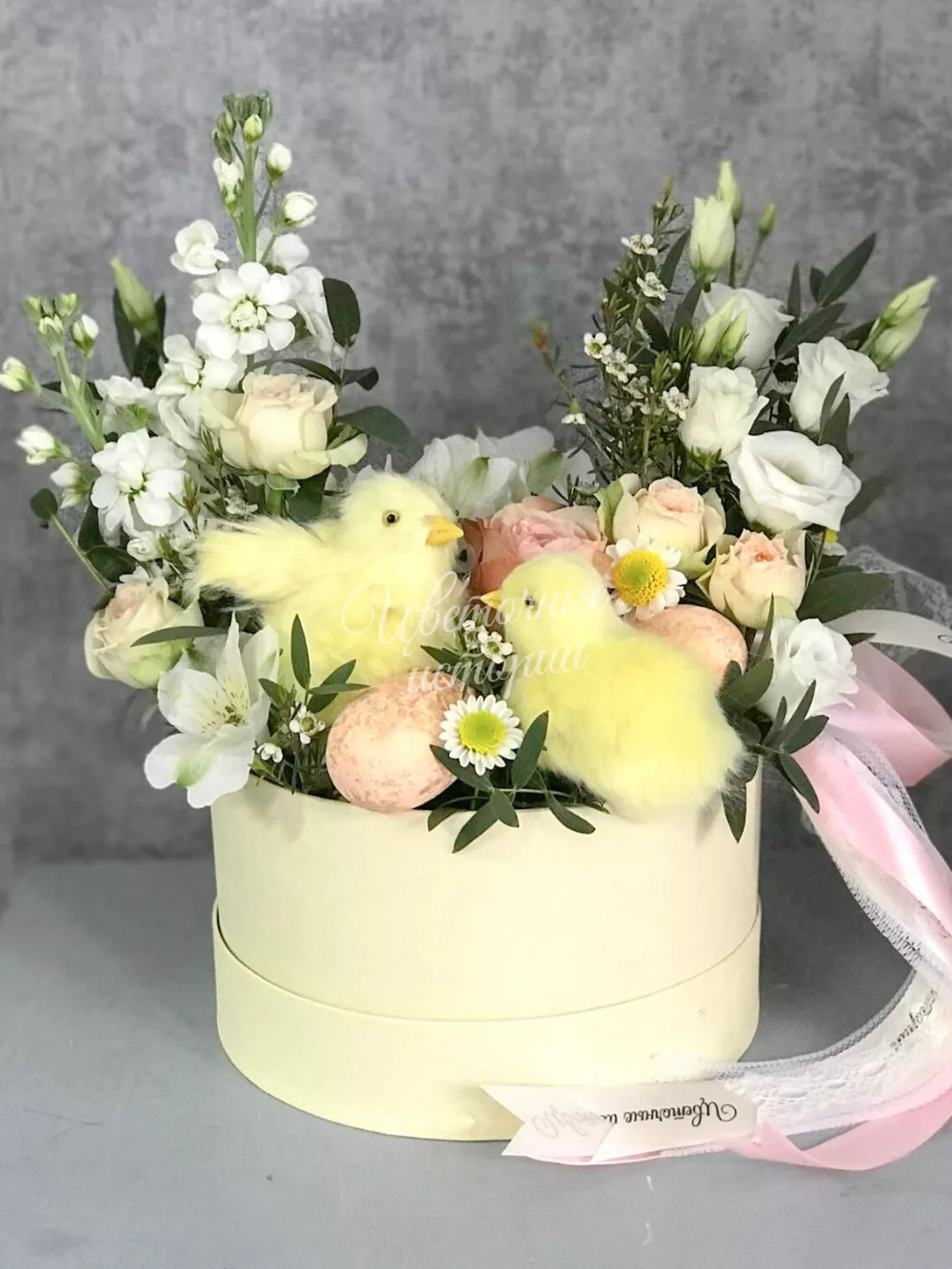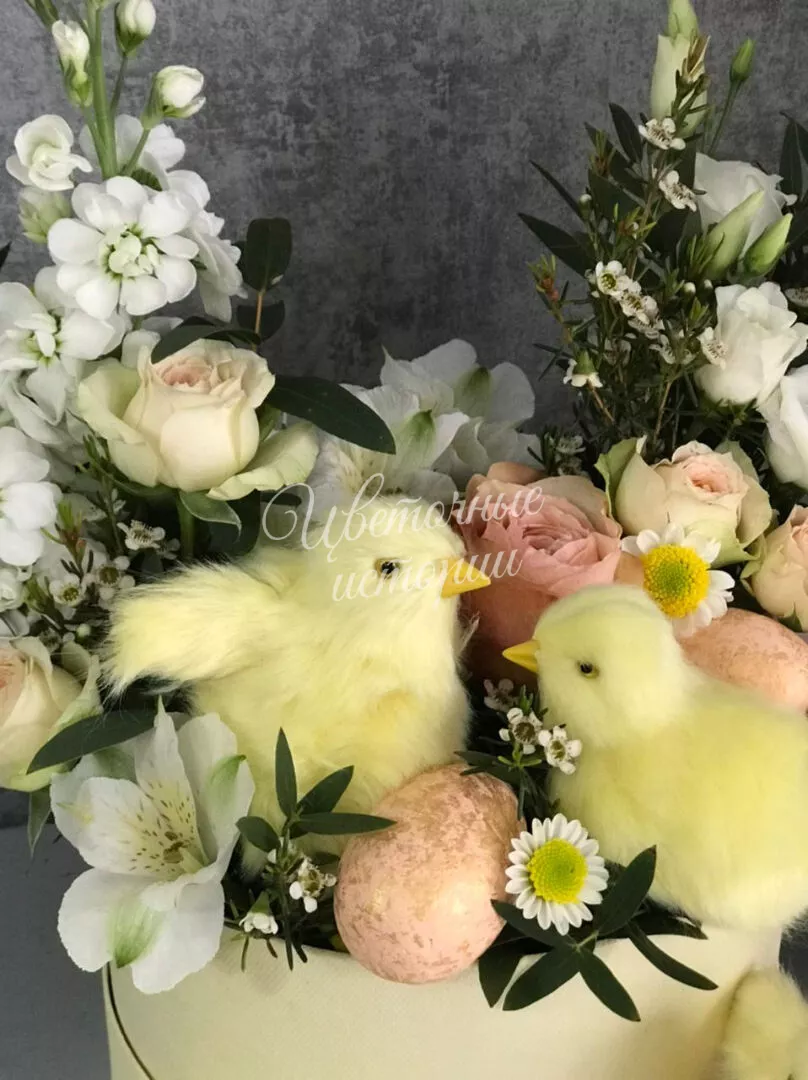Нежная композиция с цыплятами в коробке станет отличным украшением интерьера.